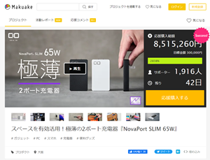 Makuake で 2ポート充電器「NovaPort SLIM 65W」がアッという間に目標金額を達成。65W の高出力なのに 14mm という極薄設計が魅力です。