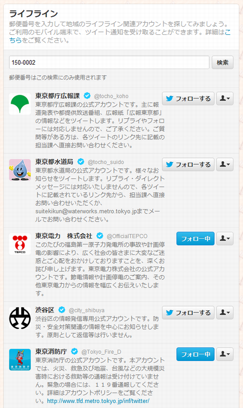 実際、私のオフィスのある渋谷「150-0002」で検索すると、東京都広報課や水道局、消防庁、渋谷区などのアカウントが表示されました。
