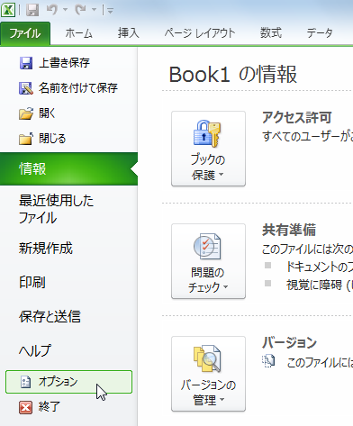 1.Excel 2010 を起動し、「ファイル」タブをクリック、