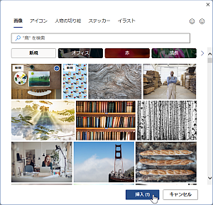 「挿入」タブで「画像」を選択、メニューから「ストック画像」を選択して「ストック画像」画面が開き、各種素材を挿入できます。