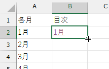 手順としては「Sheet1」のシート名を「目次」にして、セル「B1」に「目次」を追加し、セル「A2」には「1月」と入力されているので、セル「B2」に