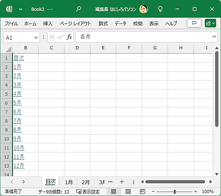 これでシート「1月」から「12月」まで、全てのシートの「A1」セルに「目次へ」のリンクができ、「目次」シートと各月のシートとの間でジャンプでき、表示を切り替えできるようになります。