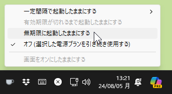 これで、一時的に自動スリープを無効にしたり、無期限に起動したままにしたり、もちろんオフにもできます。