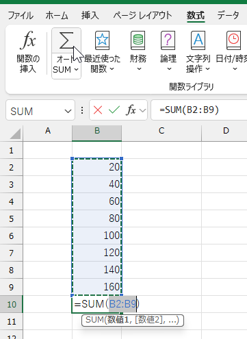 たとえば、縦に 8個、数値の入力されたセルが並び、9個目のセルに 8個の合計を計算したいとき、9個目のセルにフォーカスを当てた状態で「オートSUM」ボタンを押せば、自動で計算式が編集状態で入力されます。