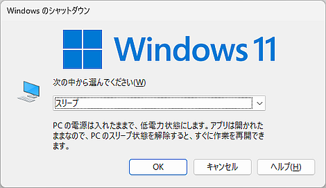- Alt + F4 「Windows のシャットダウン」画面を開く